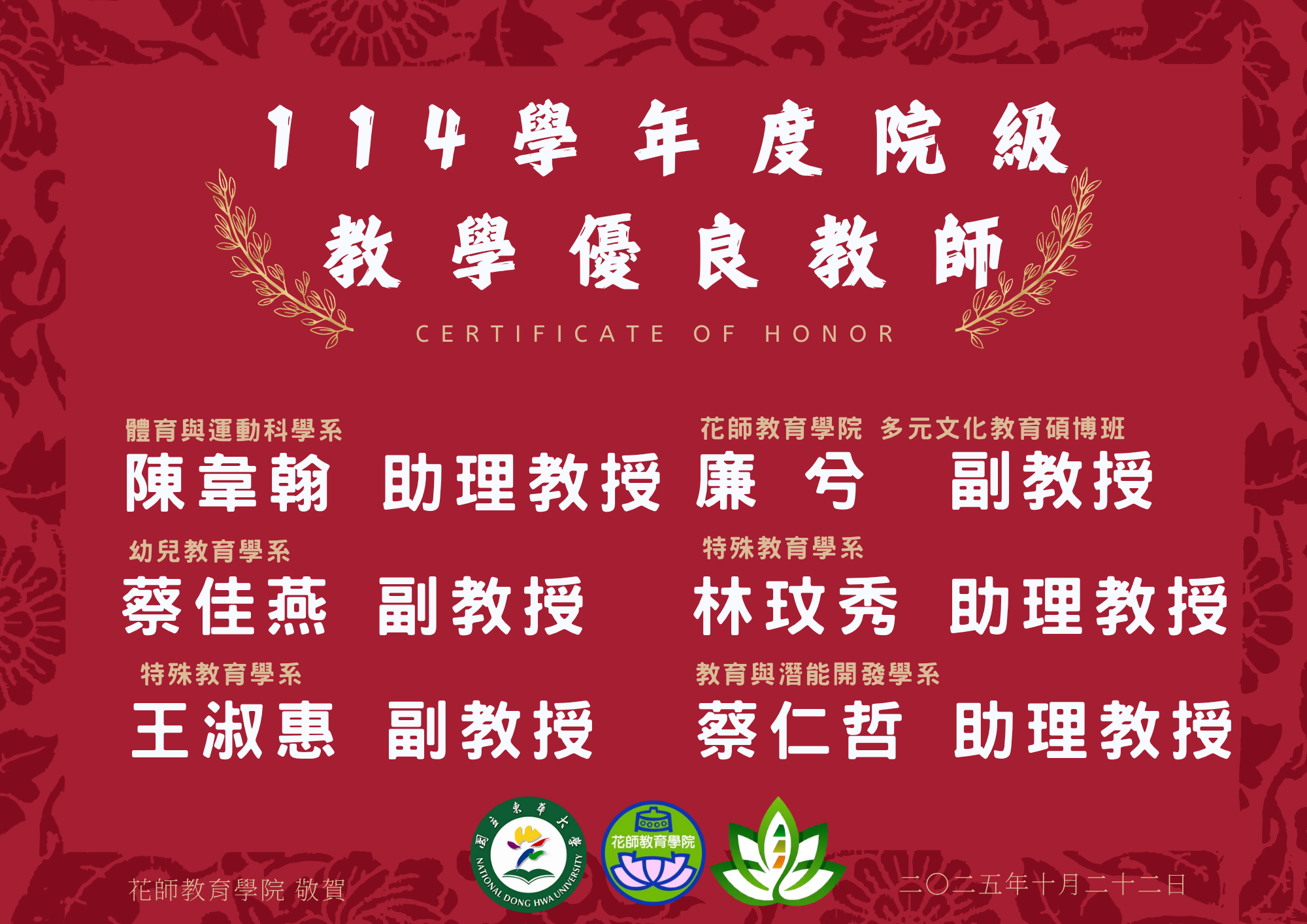 恭賀~114學年度院級教學優良教師-陳韋翰助理教授、蔡佳燕副教授、王淑惠副教授、廉兮副教授、林玟秀助理教授、蔡仁哲助理教授